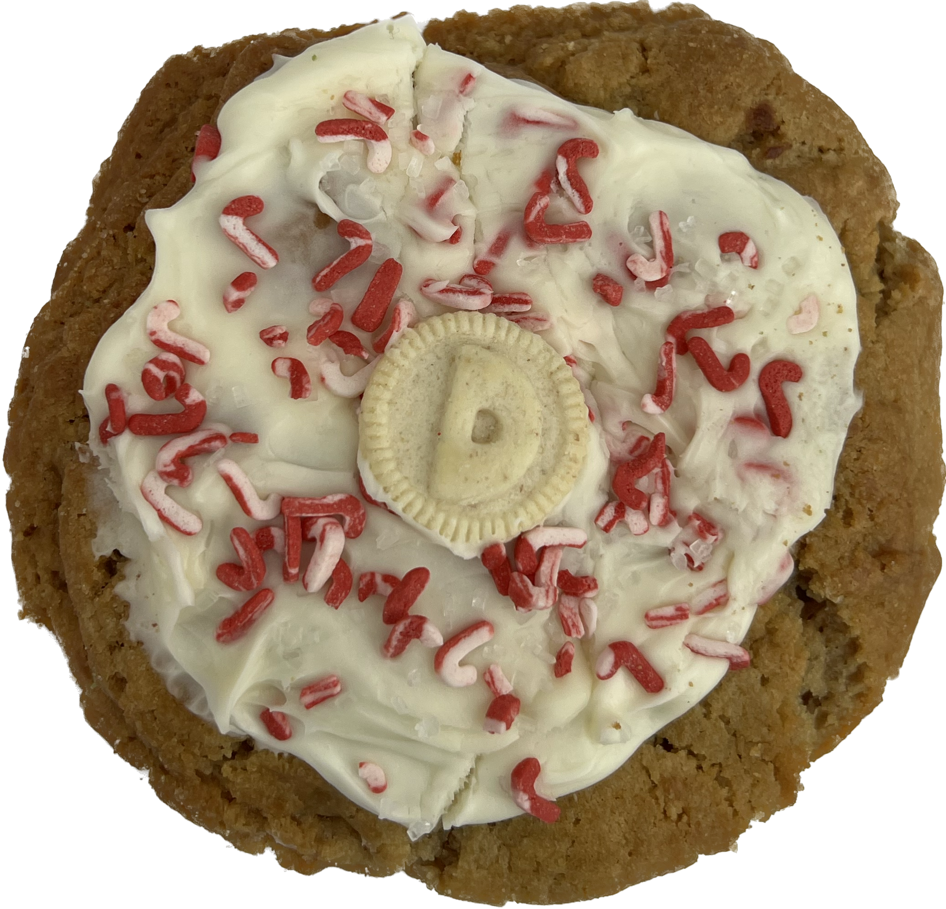 Vanilla graham cracker based cookie with vanilla frosting topped with holiday sprinkles and the iconic Dunakroo cookie